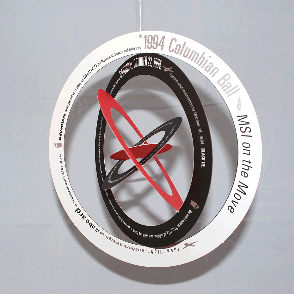 The Museum of Science and Industry’s Columbian Ball supports it’s Annual Fund. Transportation was the theme for this particular year’s fund-raising event. The scope of the project included everything from the invitation to decorations to calendars and even travel mugs. The transportation icons I designed and illustrated were used throughout the project, providing continuity to the many disparate applications. The kinetic, three-dimensional invitation/mobile references the transformation of the traveller in space and time, while also providing a whimsical reminder to attend the event.